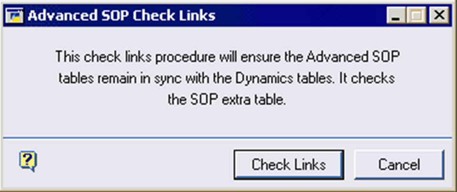 Advanced SOP has its own check links procedure. This will check all the additional Advanced SOP tables are synchronised with the standard Great Plains tables. When run, a report will be produced detailing what actions were taken by check links.
