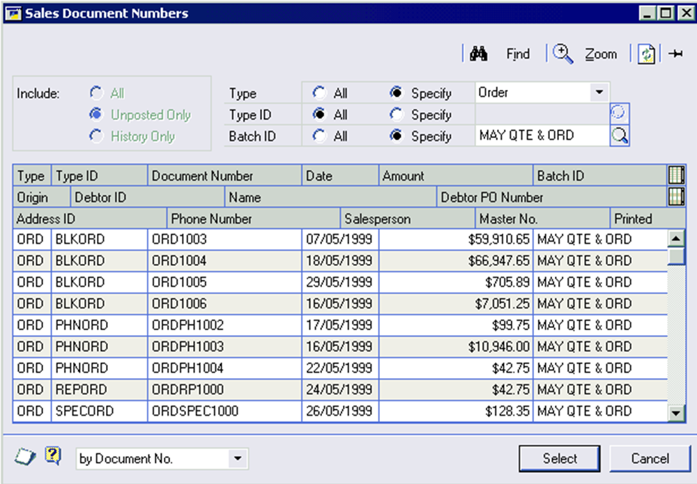 If the ‘Use Advanced SOP document lookup window’ option is selected in the Advanced Sales Order Processing setup window, the standard Great Plains lookup will be replaced with the one shown below.