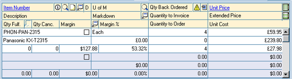 The item lines in Sales Transaction Entry, Sales Item Detail Entry, Sales Transaction Enquiry Zoom, and Sales Item Detail Enquiry Zoom now show the margin amount and percentage for that line. The Margin amount is the difference between the Extended Price and the Extended Cost. The Margin percent is the Margin Amount as a percentage of Extended Price.