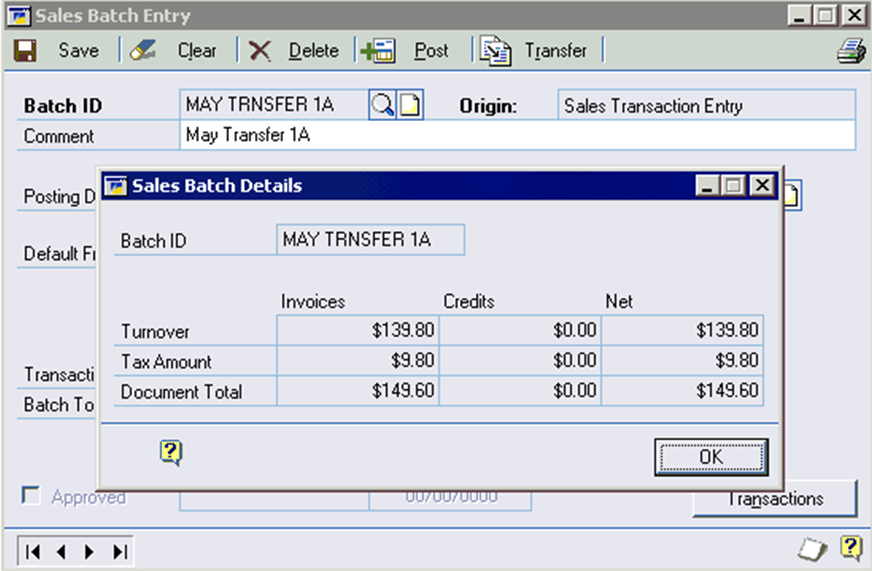 The Sales Batch Details window shows the breakdown of invoices (or invoicable transactions, such as orders) against returns, and gives a net value for the batch. It also shows the breakdown of document values and taxes.