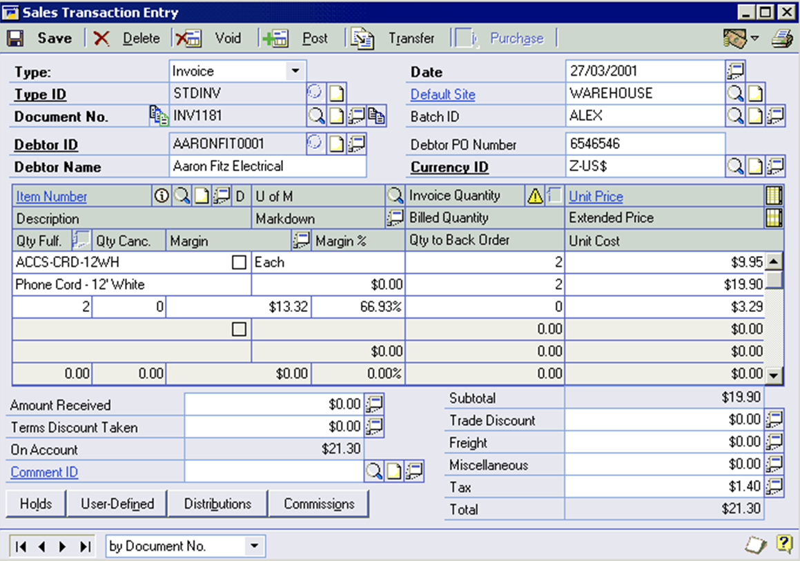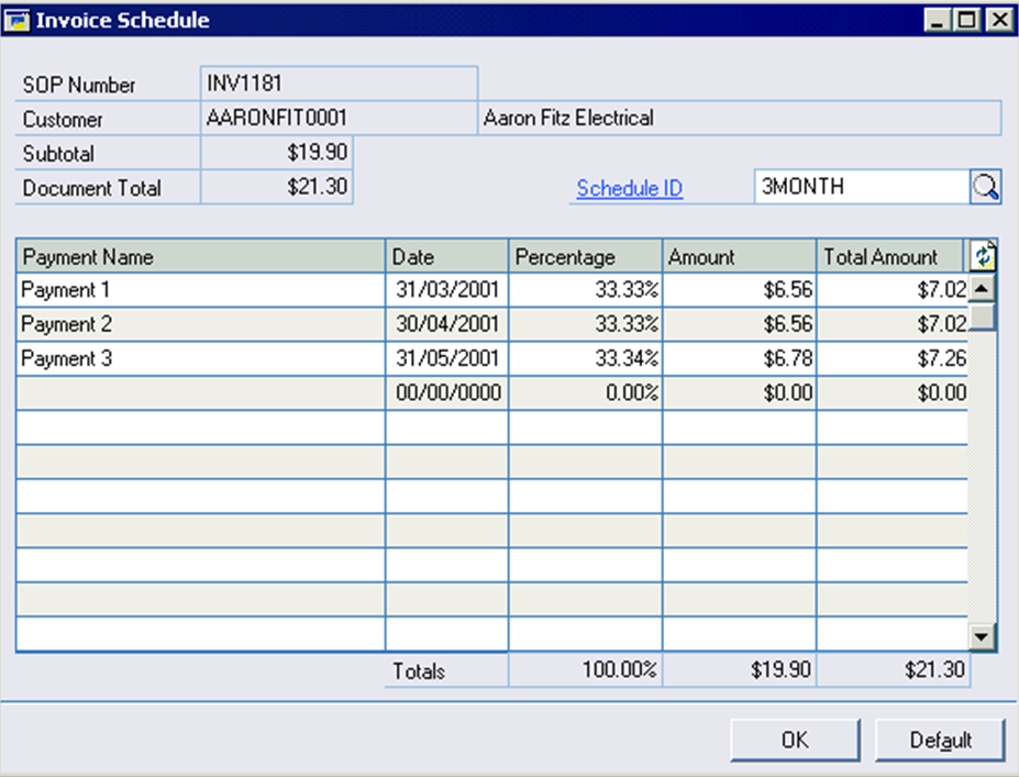 When a distributed invoice is posted, the invoice is handled normally and goes to Sales Transaction History. In Receivables Management, where payments are applied to invoices, and in the General Ledger however, the document is split into a number of instalments.