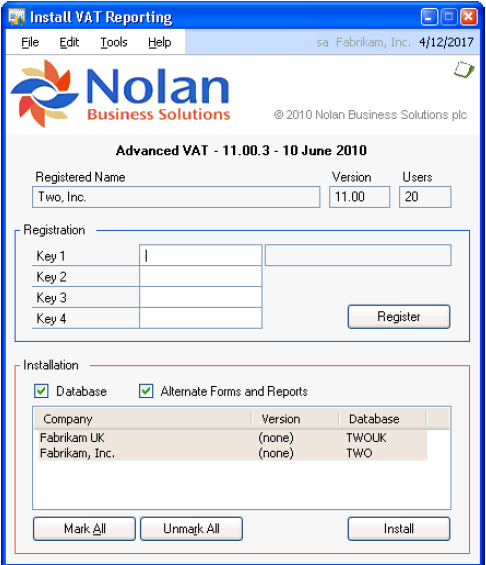 Use the Mark/Unmark, Mark All and Unmark All buttons to mark all the companies to install Advanced VAT to. Finally, push the Install button.
