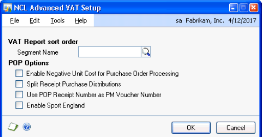 VAT Accrual Account - Enter an account number which will be used to accrue the VAT for Receipts on Purchase Orders without invoice. This is only available for Partial Recoverable Treatments.