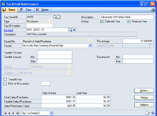 Choose OK to save the address and redisplay the Tax Detail Maintenance window.