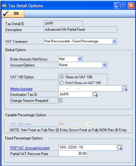 VAT Allocation - This is used to say how the VAT will be allocated for the Partial Recoverable Variable Percentage treatment. If you choose gross then the VAT will be distributed to the purchase account, and the recoverable portion will be deducted later. If you choose net then the VAT will be distributed to the account for the current tax detail id. The VAT will be then be deducted in full later, the recoverable amount put into the destination tax detail id’s account, and the non-recoverable part put in either the non-recoverable tax account (if present) or back into the purchase account.