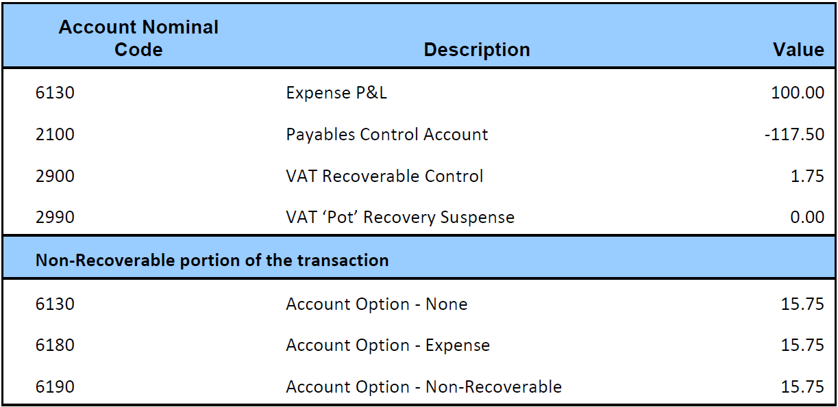 Assume a transaction where the expense value is £100, the VAT percentage is 17.5% therefore the Transaction Value is £117.50 and the VAT Value is £17.50.