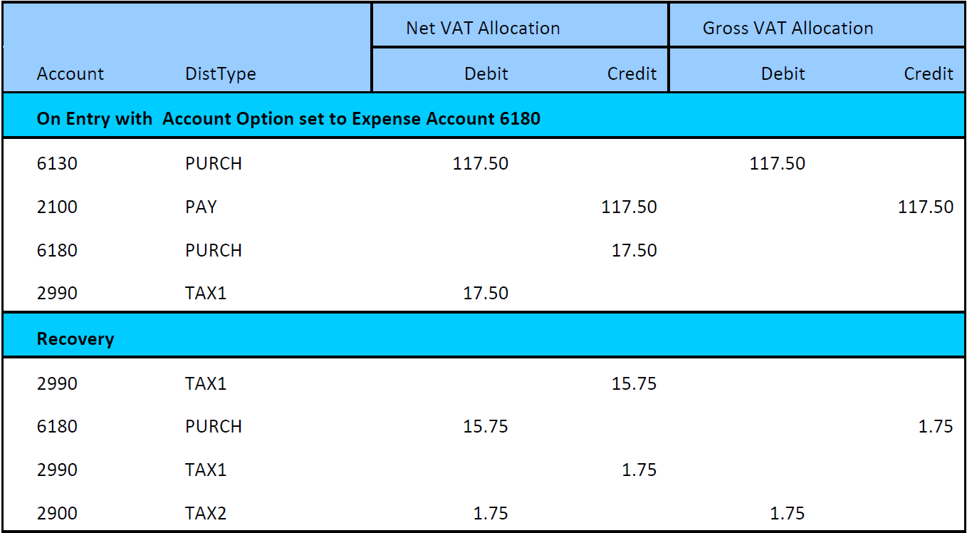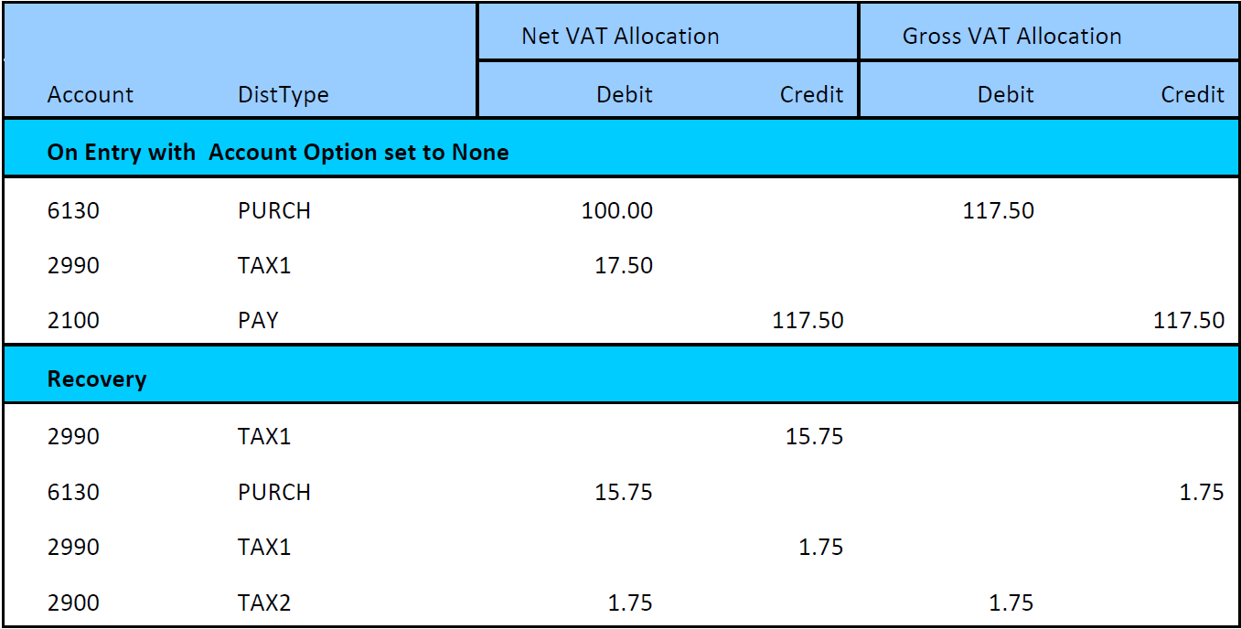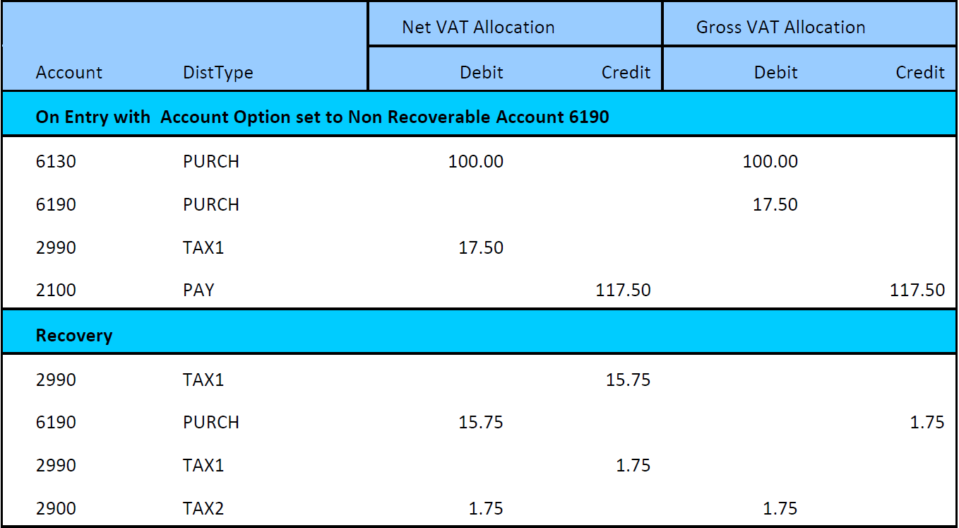 If VAT Allocation is set to Gross, the system treats the VAT portion as non recoverable.