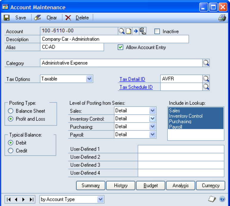Tax Detail ID - If the account is set to taxable, enter a Tax Detail ID which will default during Payables or General Ledger Entry. If a Tax Detail ID is entered this will take precedence over and Tax Schedule ID entered.
