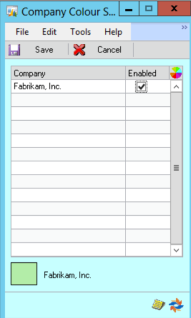 Enabled: When this checkbox is checked, the colour assigned to the respective company will show as the background colour of all windows for this company. When this checkbox is unchecked, the background colour of all windows for this company will revert to the Dynamics GP system colour (light grey).