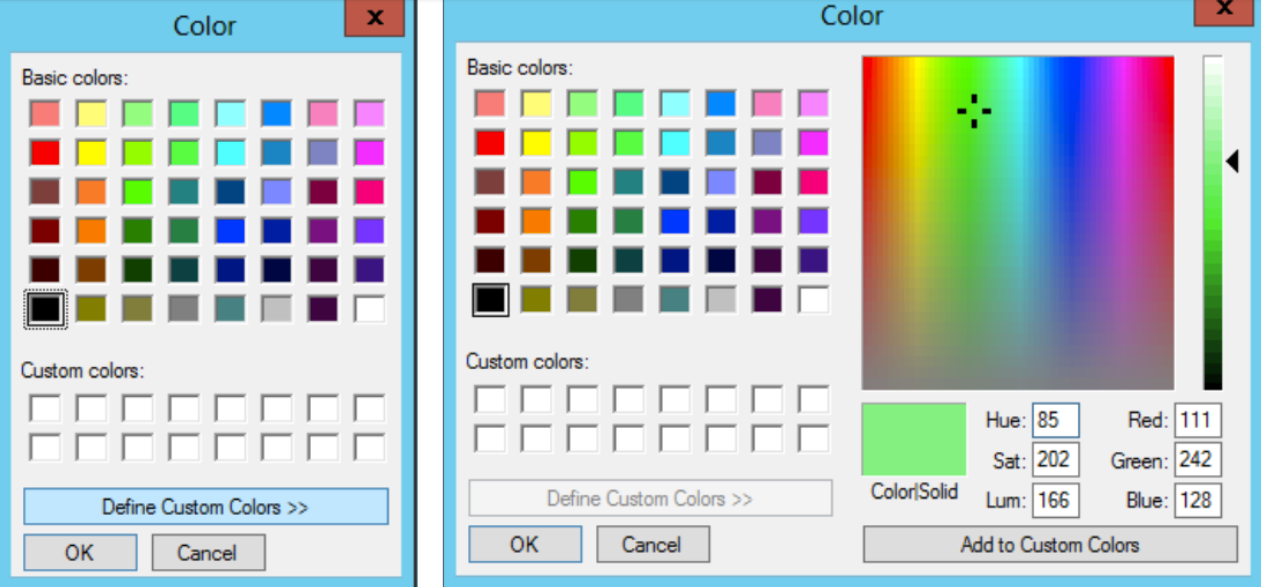 Clicking the ‘Define Custom Colours >>’ button will extend the ‘Colour’ Window to allow the user to select colours other than those displayed in the basic colour grid, by selecting a colour from the colour map and lightening or darkening the colour using the vertical slider to the right of the colour map.