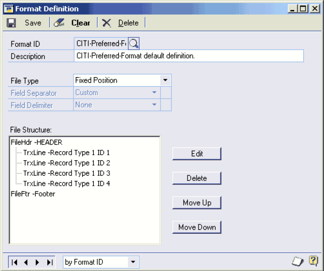 File Header, Account Header, Customer Header, Transaction Details, Customer Footer, Account Footer and File Footer.