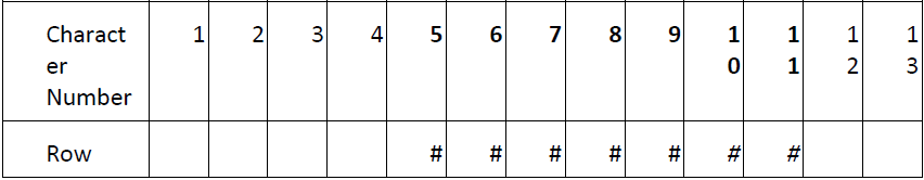 For ‘fixed format’ file types the length indicates the length of the field, i.e. the amount of characters assigned to it. So a field with a position of 5 and a length of 7 would take up characters 5 to 11 like so.