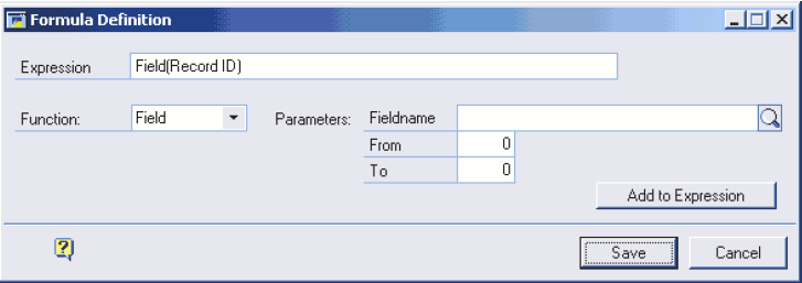 For example, if you wanted the company name in the field you are defining and the company name is “The World Online Inc”. So if you wanted the whole of the company name you would define the expression as - Field(Company Name). You could either type this directly into the expression field or, and this method is the more recommended, you can drop down the function box and select the field function and then select the fieldname lookup, find company name and select that then hit the ‘Add to Expression’ button this will add Field(Company Name) to the expression. This way is safer than typing it straight it, although the system will inform you if the expression you have entered is invalid.