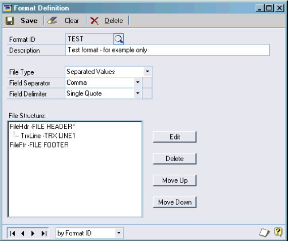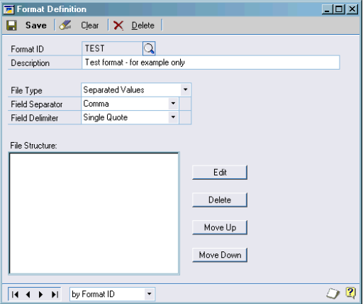 We Will open the Format Maintenance window. The first thing we need to do is name our format definition. We want to call it TEST to signify that we are just testing the system. So we type TEST into the format id field and move onto the next one which is description. Now all we want here is just a brief description of the format id. So we’ll type ‘Test format – for example only’, so that gives us a good idea of what the formats purpose is. We want a separated values file type so we set the file type option to this. And I want a comma to separate my fields and a double quote to delimit them. So we select the corresponding options from the drop down lists. Our screen should now look like this: