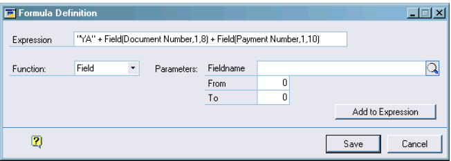 Right now I want my fifth field as Document Number but I am going to add a few things in the definition that I need in addition. I set position to 5 and I want the length to be no greater than 20. I then go into my formula window for this line. For this field I always want the first two characters to read “YA”. I go into my expression field and type in “YA” then I want to add character 1 – 8 so I select the field function then find the Document Number and put 1 into the From field and 8 into the To field. If I now hit the ‘Add to Expression’ button it will add the field expression and automatically put a ‘+’ in front of it. I now want to add the first 10 characters of the Payment Number field to the end so I select the field function, then the payment number. And indicate I want the first 10 characters out of the payment number by setting the From field to 1 and the To field to 10. I now add this to the expression. Your formula screen should now look like this:-