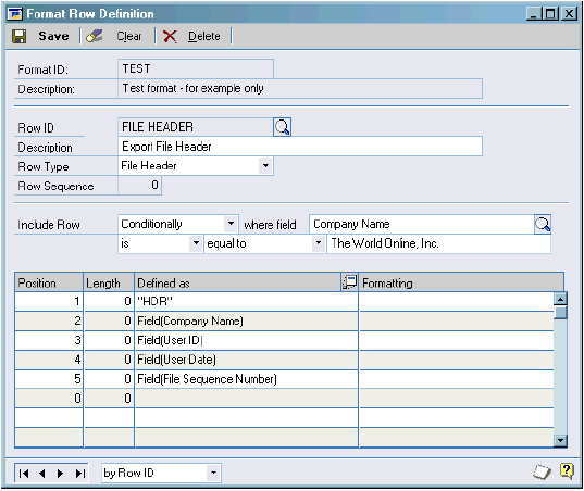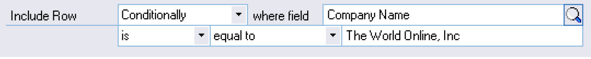 We’ll name out row FILE HEADER and describe it as Export File Header and give it a file type of ‘File Header’. And I only want this header to be printed for the test company – ‘The World Online Inc.’ I changed my Include Row options. First I change ‘Always’ to ‘Conditionally’ this frees up the other fields I need to work with. I now need to select which field I am going to place my condition on, in this case Company Name, so I open up the lookup form by selecting the lookup button and find company name and select that. And I leave the next two drop down lists because they are already set to what I need them to be set to. I.e. ‘is’ and ‘equal to’. If you find that these fields are not set correctly then just change them so that they are. Next we come to the last field in the Include Row set which is the name of the company we want the company name to equal. So, we type in here ‘The World Online, Inc.’ Your Include Row should now be looking like this: