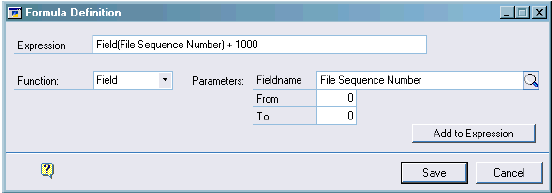 For the next field I want a SUM of the payment amounts. I select my position as 3 jump into the formula definition window, select Sum from the function list and find the payment amount field in the lookup and add this top the expression and save it. OK, for my last field I want the file sequence number so I set the position and enter into the formula definition window. I select the field function and the File Sequence Number field and add this to the expression. But I want to add a thousand to the sequence number. So on the end of the expression I type’ + 1000’. So the expression should end up like this: