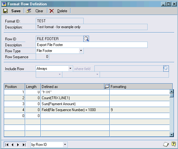 Now I want to define a File Header Row. So I hit the Edit button which brings up my row definition window. If the TRX LINE1 row is showing then just hit the ‘Clear Button’.
