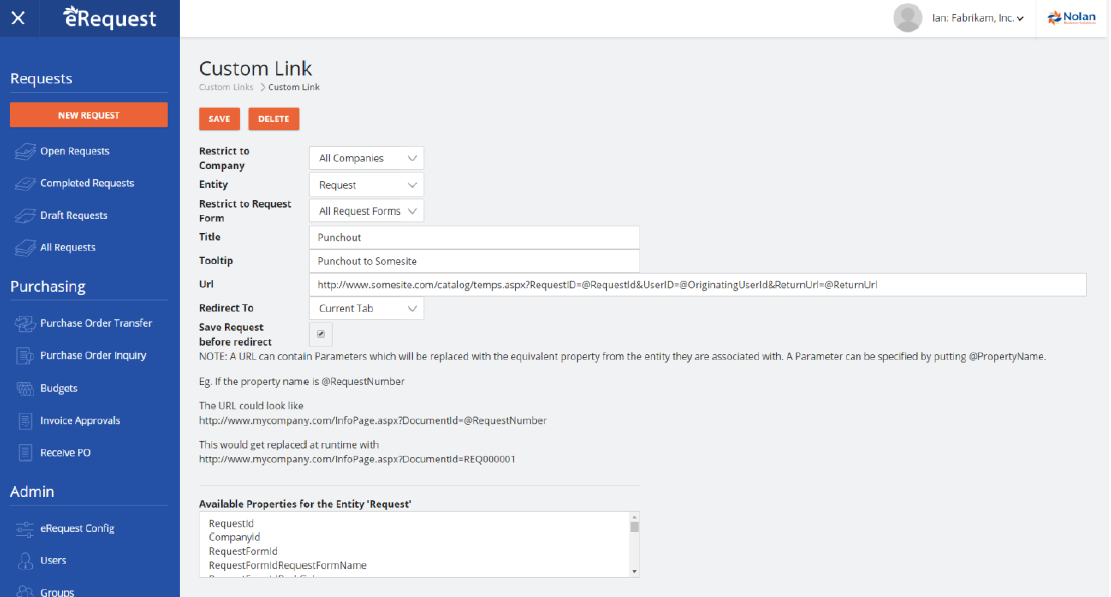 The defined URL can be redirected to a new browser tab or to the current browser tab. An option to save the current request before redirecting will prevent losing entered data.