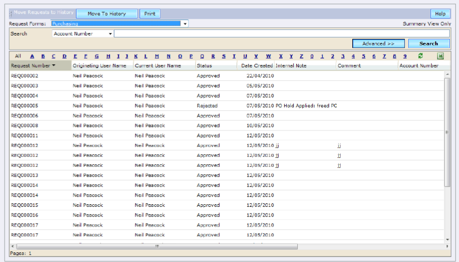 This section of the setup allows the administrator to select completed requests and to move these to History. Once in History the requests may be viewed by activating the Include History options within the eRequest Search. See the standard search window for instruction on using the search bar.