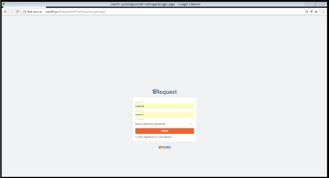 To login to the eRequest Application you need to open a Web Browser you can do this from any machine. Enter the URL for eRequest if you installed using the default setting onto a machine called ‘WEBSERVER1’ the url will be