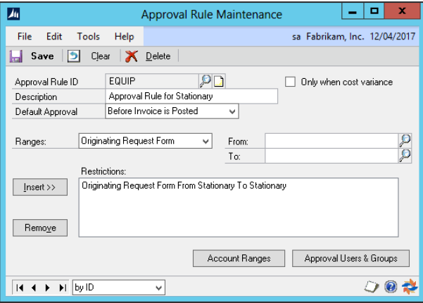 Approval Rules are evaluated when a user is entering an invoice in Purchase Order Processing Shipment/Invoice, Purchase Order Processing Invoice Entry or Payables Invoice Entry. An Approval rule specifies the conditions under which approval is required and by whom this approval is required.