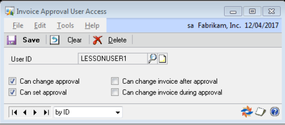 Can change invoice during approval – once the invoice has been sent for approval, giving this access to the user will allow that user to change the invoice in Dynamics GP even though the user that is approving the invoice may not be aware of the change occurring. If this option is not set, the invoice in Dynamics GP will be set as read only for the user.
