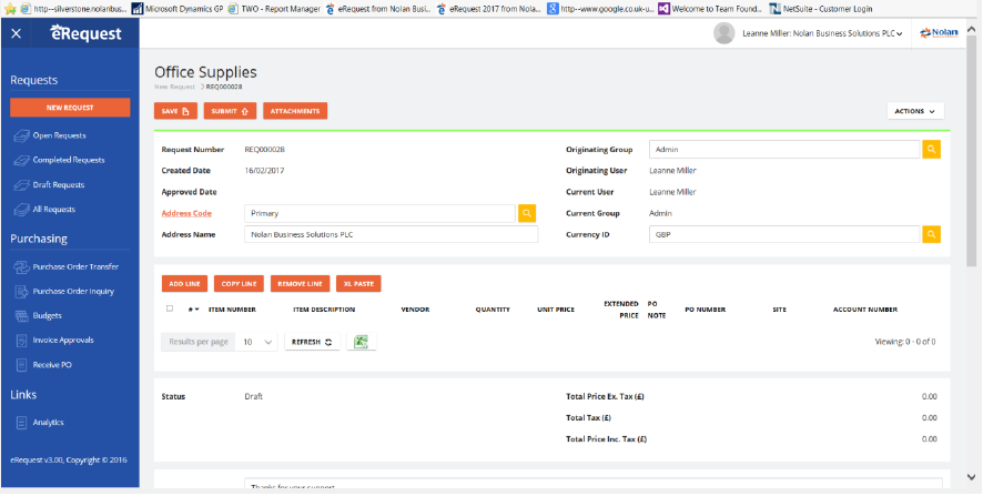 To remove lines from the Request select the line in the grid and click on the ‘Remove Line’ button.