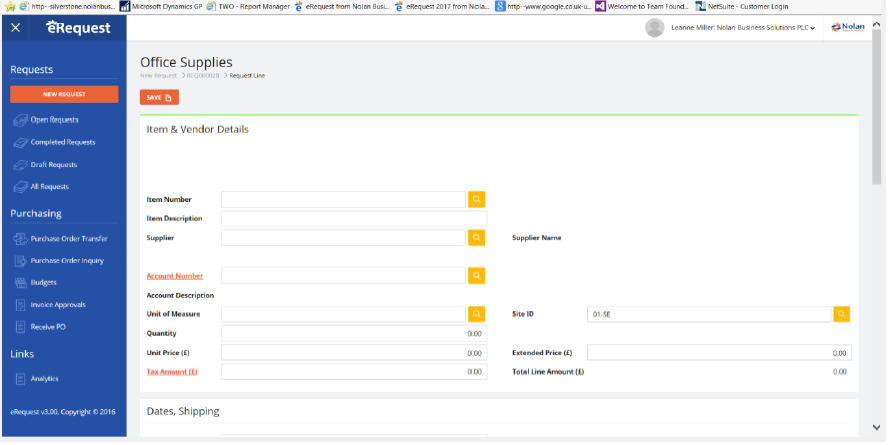 Stock Qty Available – Once the Ite.m, UofM and Stock Location Code are entered, the Quantity available will be calculated, this is based on the current Stock Available figure from the GP Stock Location, minus any requests in eRequest for this item which are still pending, minus the Quantity Requested on this request.