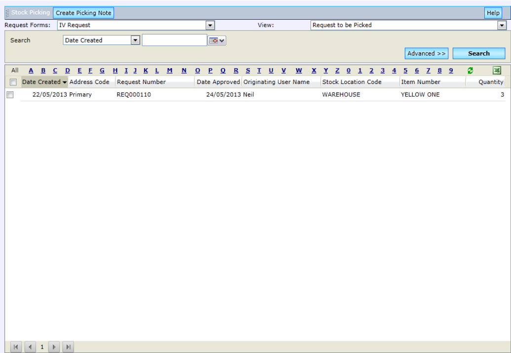 This view shows all the Approved Stock Requests Lines which have already been allocated a Picking Note Number. You can see the Picking Status and pre-print the Picking Note