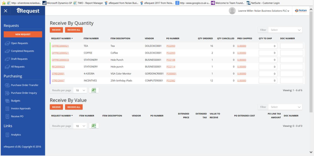 From the main page click on Receipts tab. This view shows all Purchase orders which were transferred to Dynamics GP from Requests your user originated. These Purchase Order line can then be received and a Shipment Receipt created in Dynamics GP.
