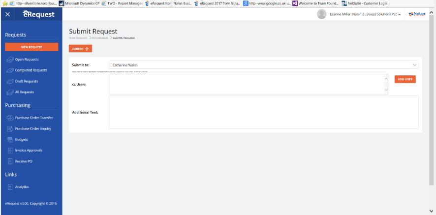 To submit a request for approval, open the request from one of the view by double clicking on it. Click on the ‘Submit’ button. You will then be prompted to select a user to send the request to: