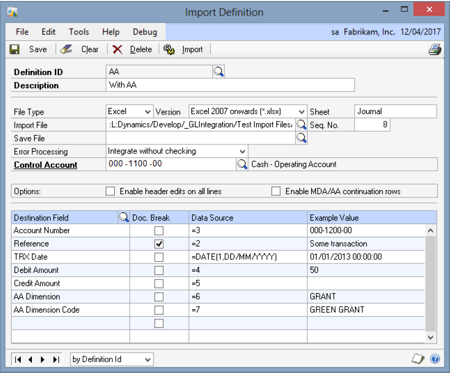 The ‘Enable MDA/AA continuation lines’ option allows some lines from the import file to be treated as more MDA or AA lines for the previous distribution, rather than as another new distribution line. When enabled, any line which has the same nominal account as the previous line, and has a zero amount, will have any MDA or AA information added to the previous distribution. Any number of MDA/AA continuation lines can follow a distribution line.