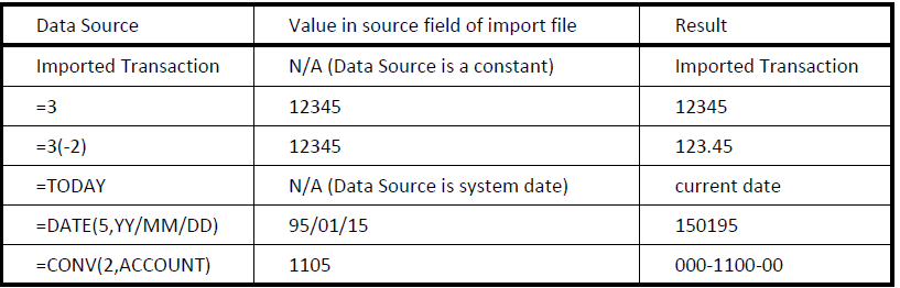 The Data Source field indicates where the value for the Destination Field is taken from. This may be a simple constant value, such as a fixed description, or it may be taken from the source file.