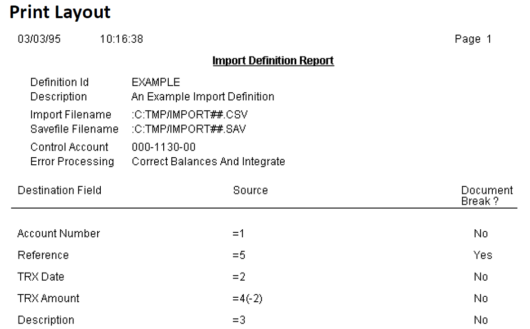 This report is produced by selecting Print from the File menu when within the Import Definition window.