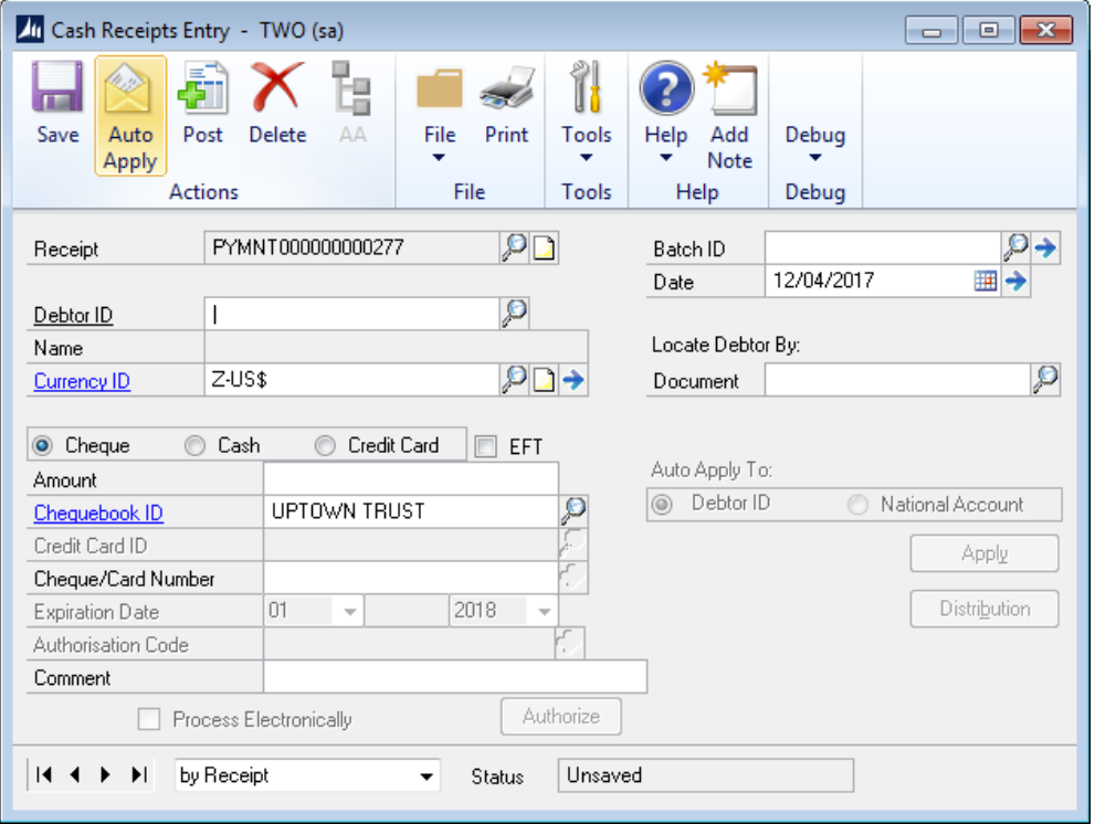 The collection processing creates Cash Receipt Transactions within Microsoft Dynamics GP. These transactions