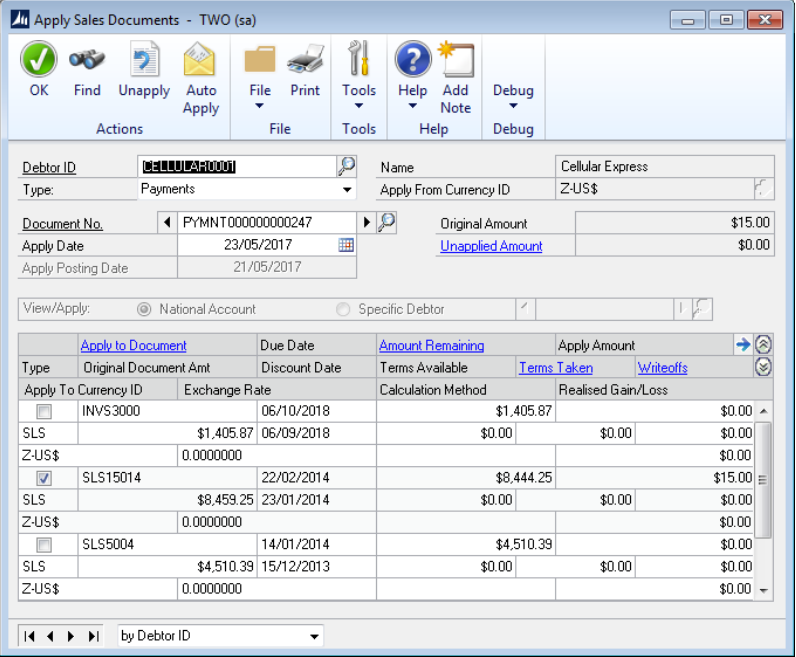 The Apply Sales Document window has been amended to manage the apply of the cash receipt to the individual Schedule Lines if using the Sales Order Processing mode. If the document to which the payment is applied is changed, marked or unmarked the relevant change is automatically applied to the Scheduled Payment schedule.