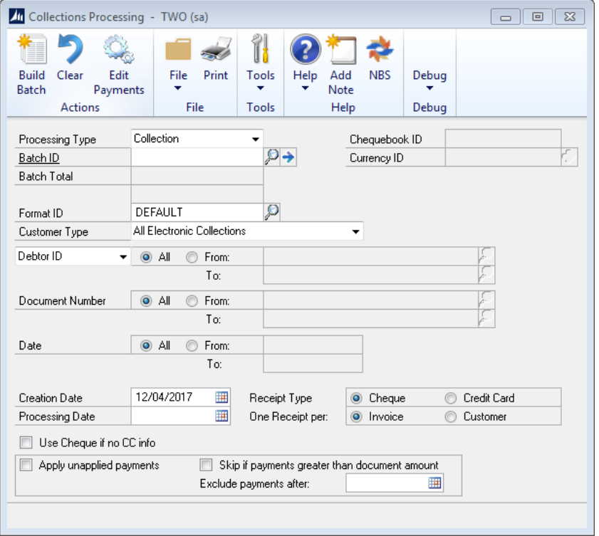 The collection processing is the part of the module that allows the user to specify the collection criteria and runs the process to create a batch of payments to be received. This batch is a Standard Microsoft Dynamics GP Cash Batch thus enabling the entire Microsoft Dynamics GP Batch processing features such as Edit Lists, amendment of transactions, allocation and posting.