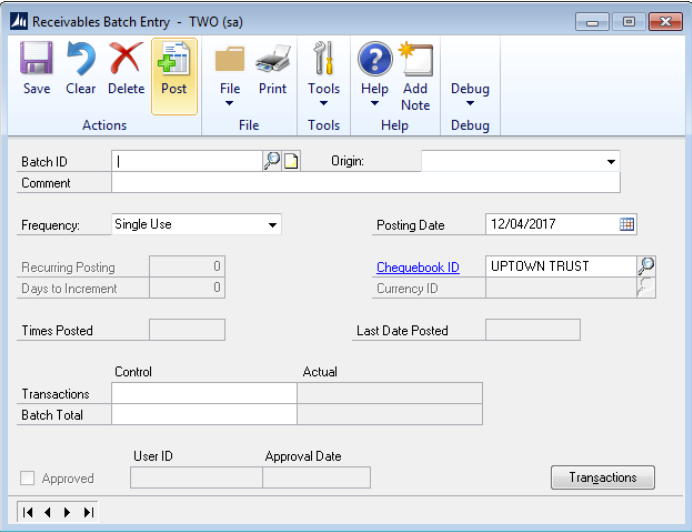 Once the Build Batch button is pressed, the module reads through the Scheduled Payment Schedule. A Cash receipt will be created for each schedule line which falls into the collection criteria i.e the Customer ID’s and Document Numbers specified and where the Schedule date is in range and the applied amount is equal to zero. Scheduled Payment schedule lines which are marked as “On Hold” will be ignored.