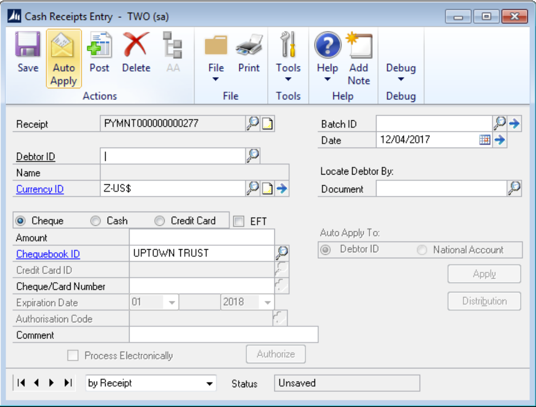 When creating the Cash Transaction, Scheduled Cash Collections will create the transaction either as a Cheque Payment in which case the Chequebook ID will be defaulted from the Receivables Batch or as a Creditcard Payment in which case the Creditcard ID from the Customer will be used. The Receipt Type Option on the window enables the user to select the type used in the collections process. There is a tickbox also in this window labelled “Use Cheque if no CC Info”.