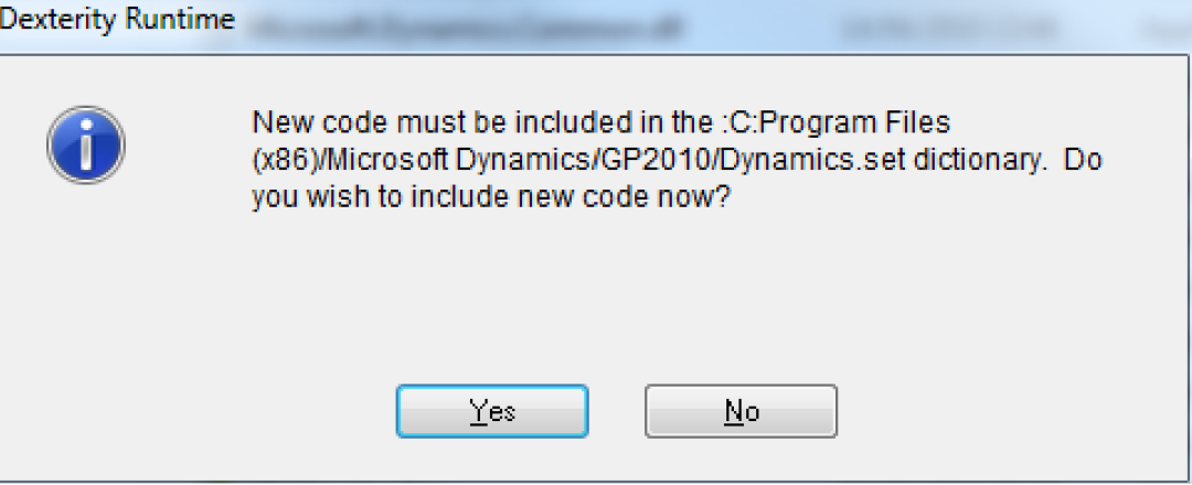 - During the start-up of Microsoft Dynamics a you will be prompted to include new code. Select “Yes” to include the new code.