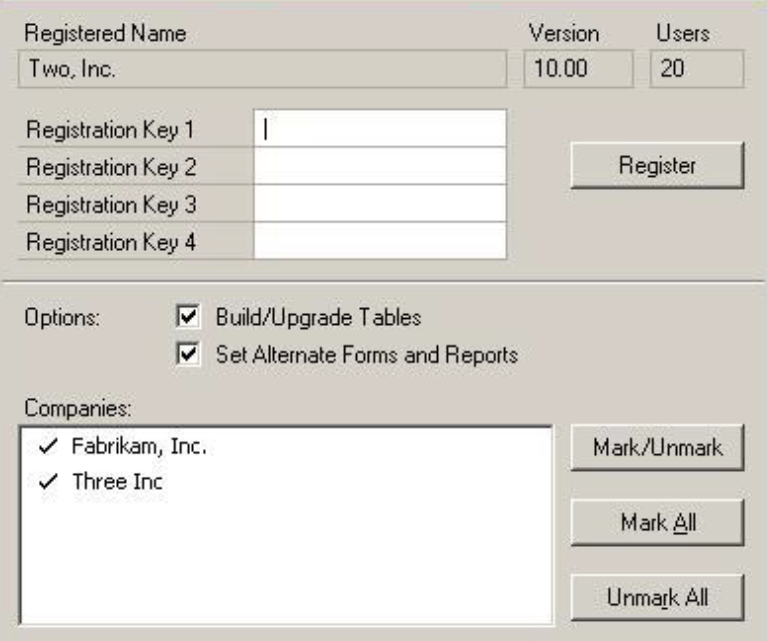 - Click on the “Register” button, you will receive a message indicating that Registration was successful.7. Choose which Companies to install the application for by highlighting them in the Installation List and clicking the “Mark/Unmark” button or by using the “Mark All” and “Unmark All” buttons.
