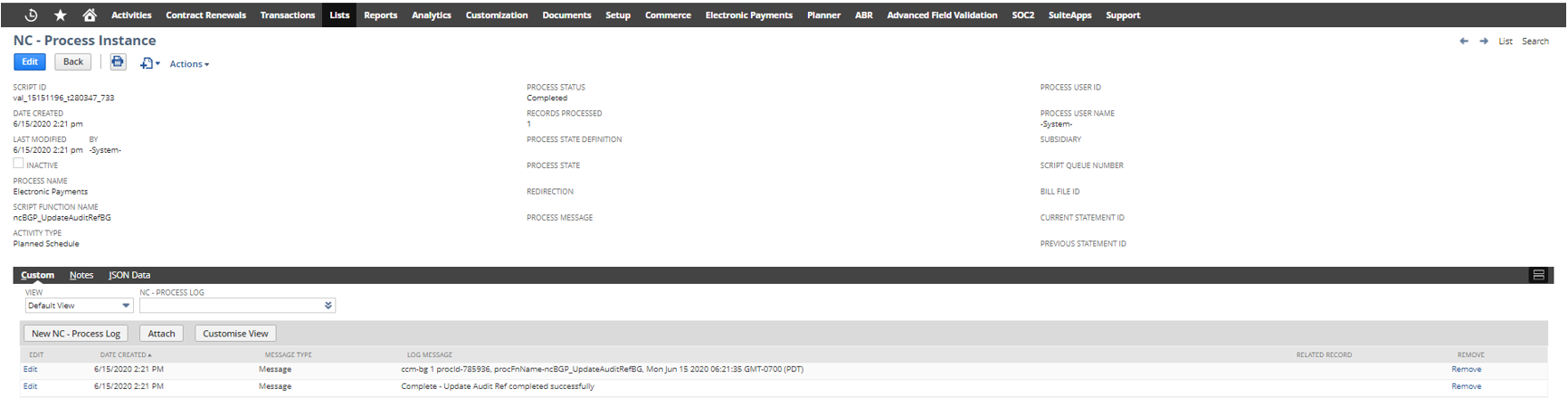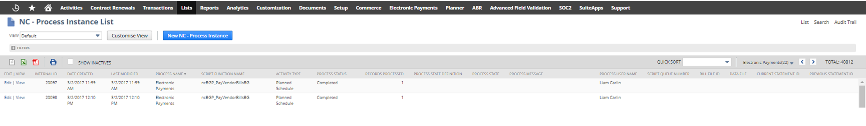 In order to optimise application and database servers, NetSuite have implemented mechanisms to govern the usage of SuiteScript. NetSuite’s SuiteScript thresholds are based upon the volume of activity that a company’s users can manually generate, as well as a provision for automated functions. For this reason, Electronic Payments transaction processes, Pay Vendor Bills and Generate Export File are carried out in the background and are controlled by scheduled server scripts and process instance records.