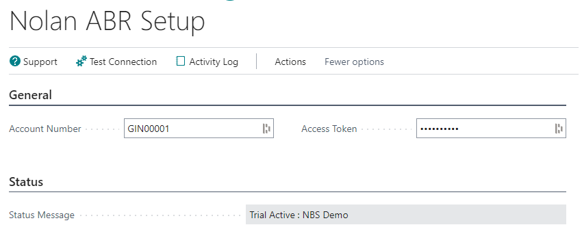 If you need to set the connection from here then you can access the Account Number and Access Token from your setup page in Nolan ABR. Entering this information will automatically attempt to connect to Nolan ABR or you can hit the "Test Connection" button.