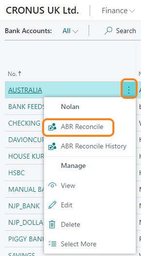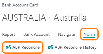 Alternatively on the Bank Account Card in Business Central, locate the Nolan action menu and select ABR Reconcile