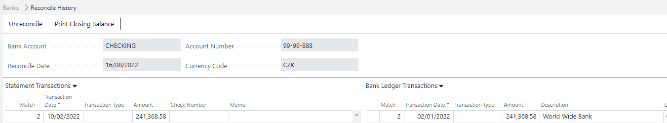 The ABR Reconcile History page is a version of the ABR Reconcile window that allows you to view historic reconciles. You can operate the page exactly the same as the standard reconcile window for sorting, filtering etc. The window does have a reduced action set which you can perform and the all the fields are ready only.