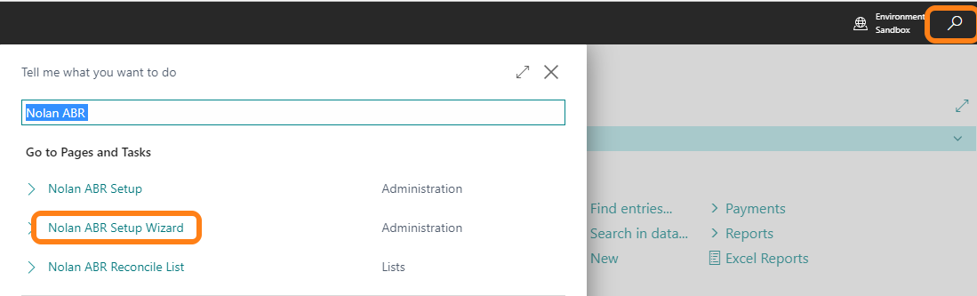 The Nolan ABR Setup Wizard will automatically run after the installation process in Business Central has been completed. If you encounter any issues or want to run the wizard again then you can locate the wizard by searching for Nolan ABR in the search box and selecting "Nolan ABR Setup Wizard" as shown here: