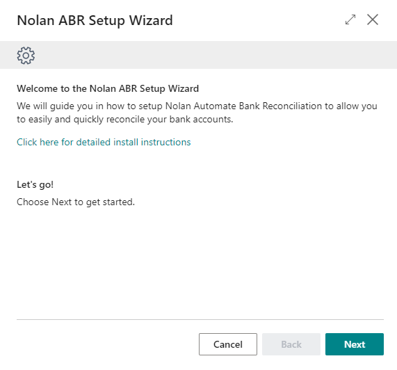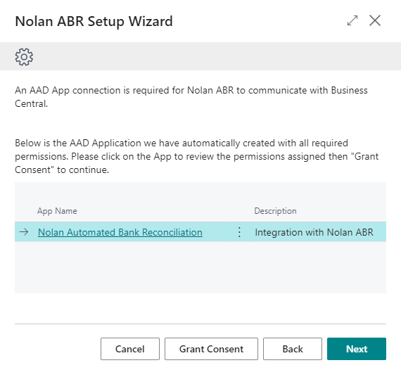 Nolan ABR needs to be able to talk to Business Central to exchange transactional data and read bank information etc. To set this up, a AAD App will need to be created and authenticated. Helpfully, Nolan ABR will have created an AAD App record for you inside business central, which will be displayed on this wizard page: