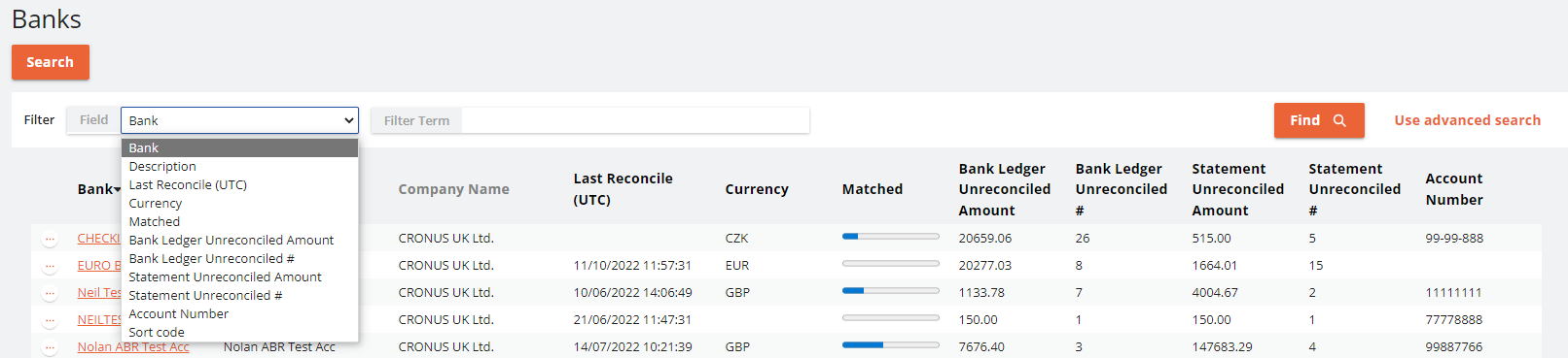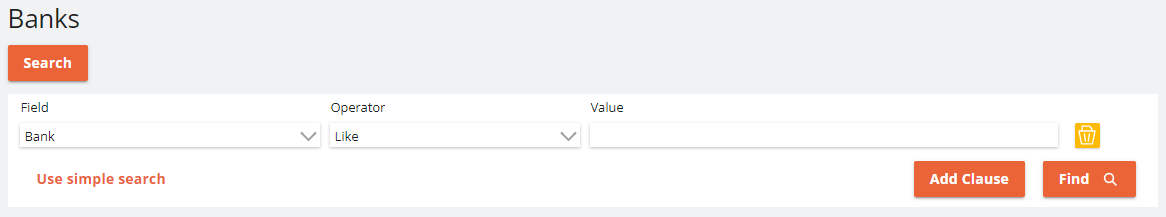 To use the advanced search function, simply pick a field, then choose an operator to apply to the available search functions. Then type the value you want to apply against the field and add the clause.
