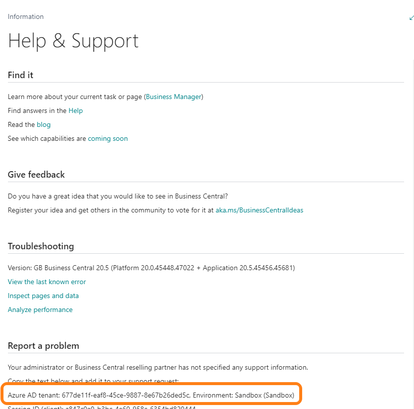 At the bottom of the page under Report a problem you will see both the Azure AD tenant and the environment name and type. If you do not have access yourself, you can ask your customer to retrieve the information.